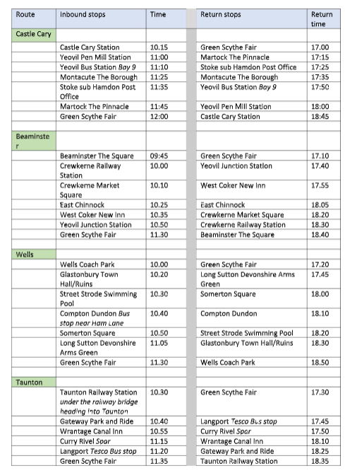 Free return trip bus travel to the Green Scythe Fair from Castle Cary, Yeovil,